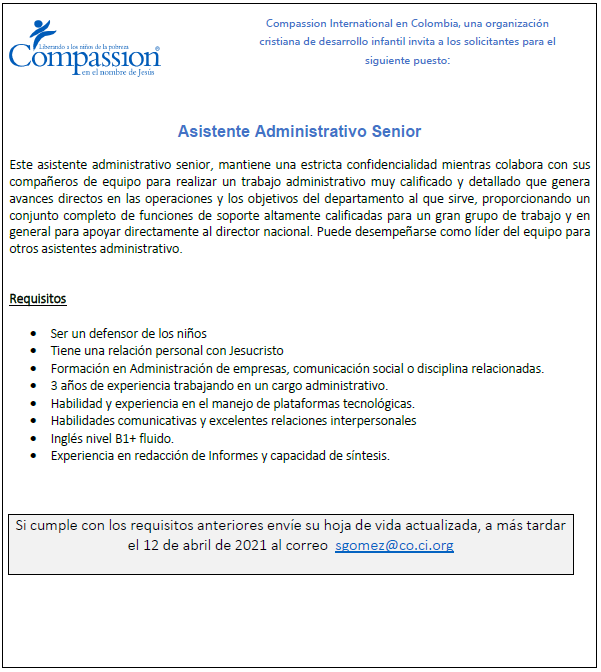 Compassion International ColombiaAnunciamos que se abre la convocatoria externa para el cargo de Gerente Senior de Sociedad. Ubicación ...